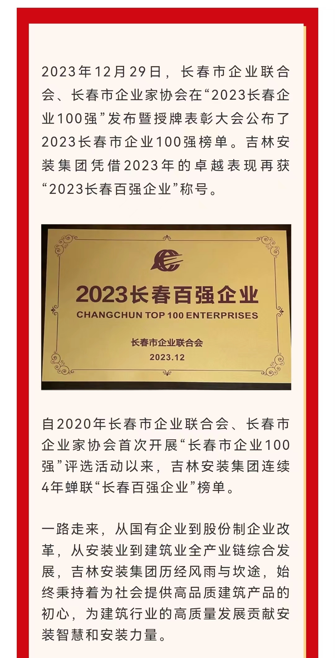 吉林安装集团再获“长春百强企业”称号